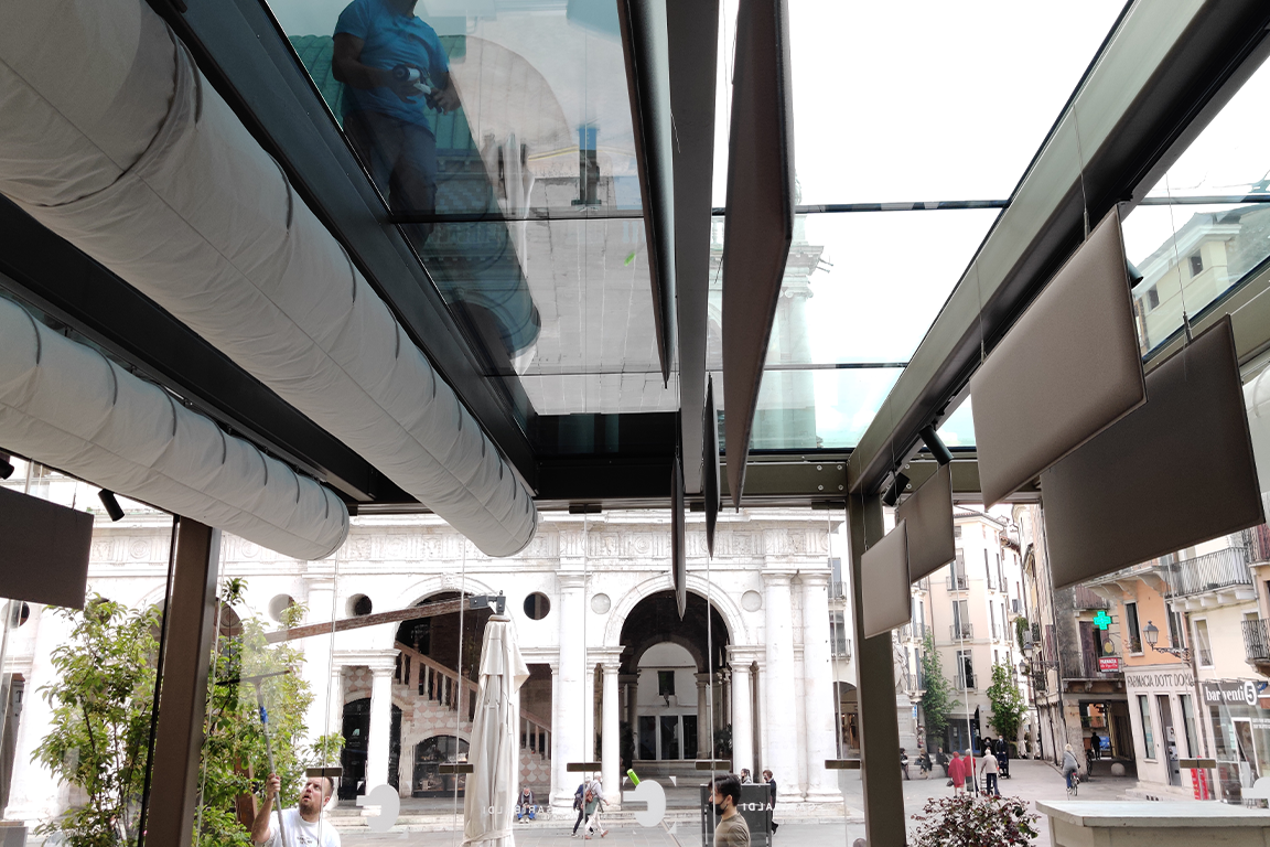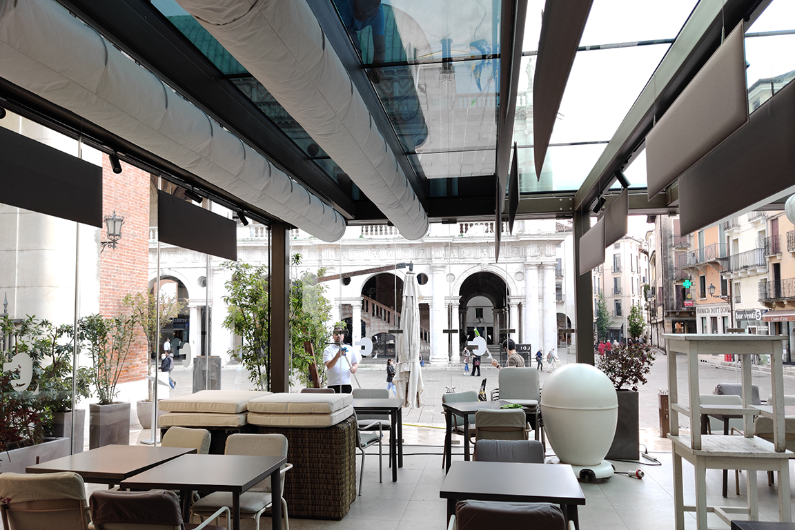 Centro storico di Vicenza, Ristorante Stellato dove il cliente viene coccolato al 100%, ma rimaneva il solo problema dell’abbaglio e del caldo causato dall’irraggiamento diretto del sole. Problema risolto posando sulla copertura in vetro basso emissivo la pellicola “Sentinel Plus Dx05” prodotte da Saint-Gobain che riflette con questo tipo di vetro il 95% dell’Energia Solare riducendo del 91% l’abbaglio.